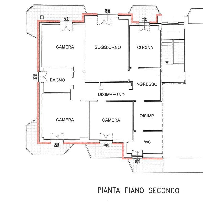 Ingresso, grande disimpegno guardaroba che può essere adibito anche a studio, cucina abitabile con balcone, salone facilmente collegabile con la cucina a creare un grande open spece, wc dotato di un comodo balcone, disimpegno notte, tre camere tutte dotate di porta finestra affacciata sui rispettivi balconi, secondo bagno padronale.